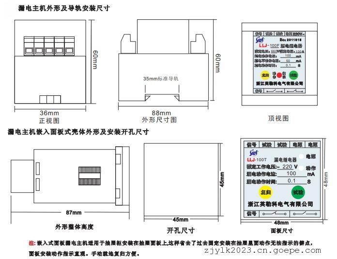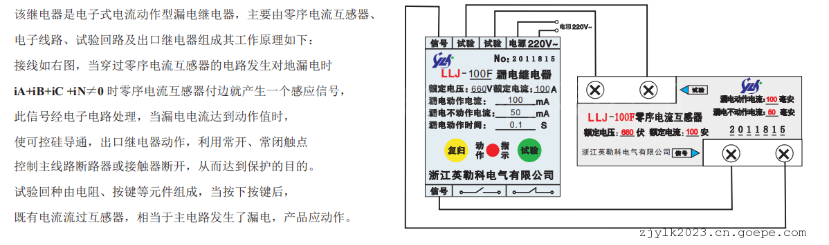 该继电器可与带分励脱扣器或失压脱扣器的断路器、交流接触器、磁力启动器等组成漏电保护装置,作漏电和触电保护之用,可配备蜂鸣器、信号灯等各种声光指示器件结合组成漏电报警装置。